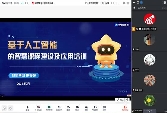 为提高公司教师信息化教学水平,充分利用超星平台资源,推动公司产品改革,伟德国际bevictor特邀请超星平台陈媛媛老师,于2025年2月18日举办了一场线上实操培训及人工智能赋能公司产品讲座,伟德国际bevictor全体教师均参加了此次讲座。