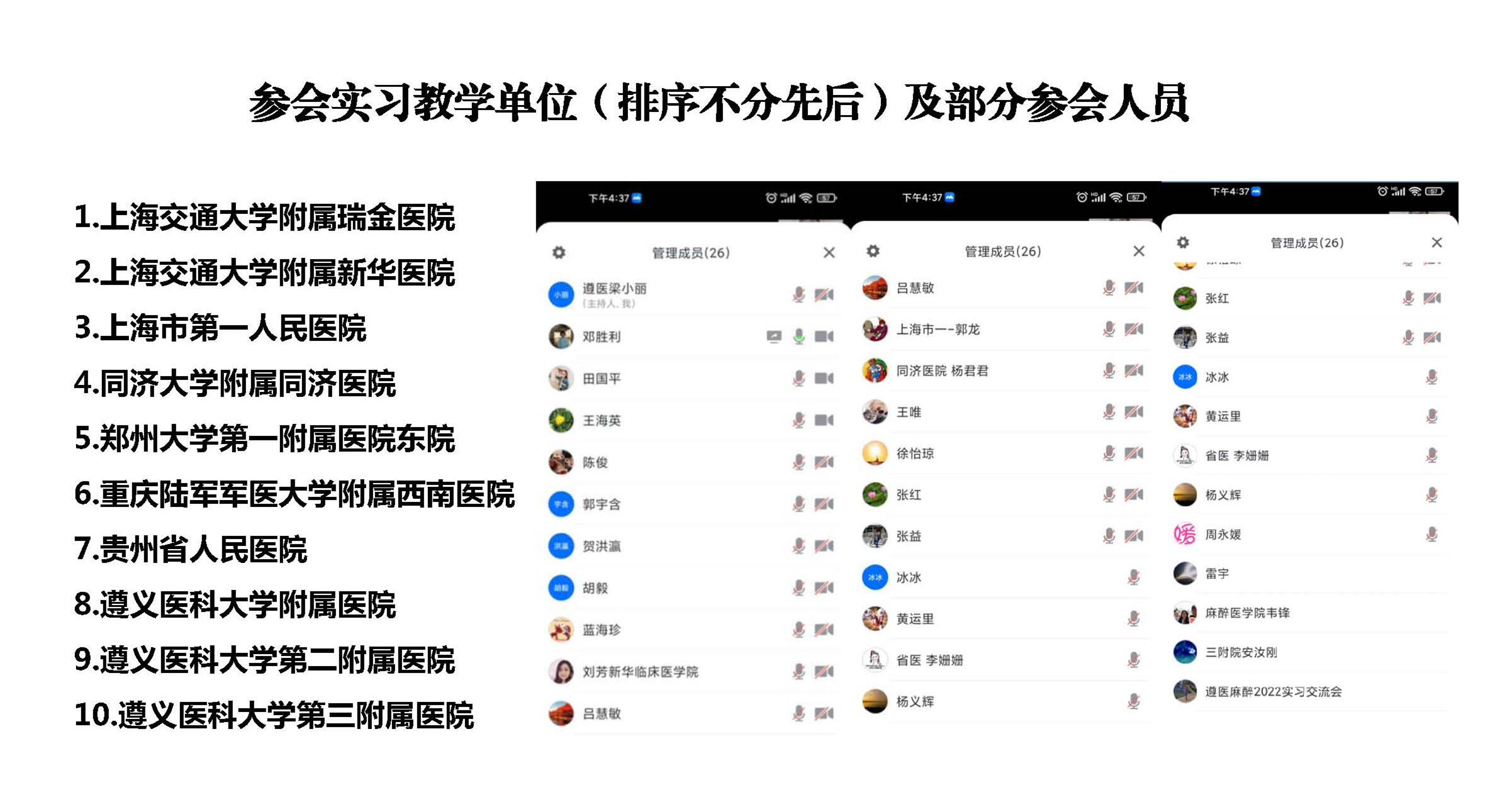 随后,临床麻醉学教研室副主任邓胜利,从公司新修订的实习大纲、实习教学活动、出科考核等实习教学要求,实习管理面临问题及解决办法等方面进行交流。郑州大学第一附属医院杨建军主任及吕慧敏老师,交流了该院及科室情况、实习生管理、轮转安排、带教老师安排、出科技能考核等实习教学管理经验。重庆陆军军医大学附属西南医院鲁开智主任,上海交通大学附属瑞金医院徐怡琼老师,上海市第一人民医院郭龙老师等与会教师进行了交流发言。