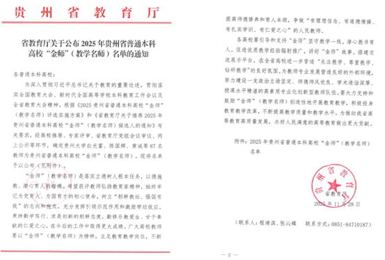 贵州省教育厅公布2025年贵州省普通本科高校“金师”(教学名师)名单,公司秦榜勇教授获评高校“金师”荣誉称号。